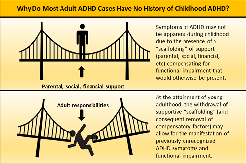 Two recent studies, both published in JAMA Psychiatry, have shed new light on the prevalence, prospective disease course, and emergence of attention deficit hyperactivity disorder (ADHD) in young adulthood. In the first study of over 2000 individuals, Agnew-Blais and colleagues found that only 21.9% of patients diagnosed with childhood ADHD continued to meet ADHD diagnostic criteria as young adults (age 18 years). Conversely, among individuals with adult ADHD (age 18), the vast majority (67.5%) did not meet diagnostic criteria for ADHD during childhood. The second study (including over 5200 individuals) conducted by Caye et al, had similar results; only 17.2% of individuals with childhood ADHD met diagnostic criteria as adults (age 18-19 years) and 87.4% of adults meeting criteria for ADHD did not meet criteria during childhood. The authors of both studies had varying conclusions about these results, including the idea of adult ADHD being a disorder distinct from childhood ADHD with different etiologies. However, one of the most compelling analyses of these studies can be found in the editorial by Faraone and Biederman. These authors propose that the emergence of ADHD in young adulthood might reflect the loss of supportive "scaffolding" present during childhood. In this sense, ADHD may indeed be present in childhood but without overt manifestation of symptoms because parental and social support are enough to compensate for symptom-associated functional impairment. Once the individual reaches young adulthood and that supportive "scaffolding" is removed, symptoms are revealed and greatly affect ability to function (see Figure). Regardless of which conclusion(s) may be correct, it is clear that adult-emergent ADHD warrants further study and that adults who present with symptoms of ADHD that impair daily functioning should be treated whether or not ADHD was ever recognized during their childhood.